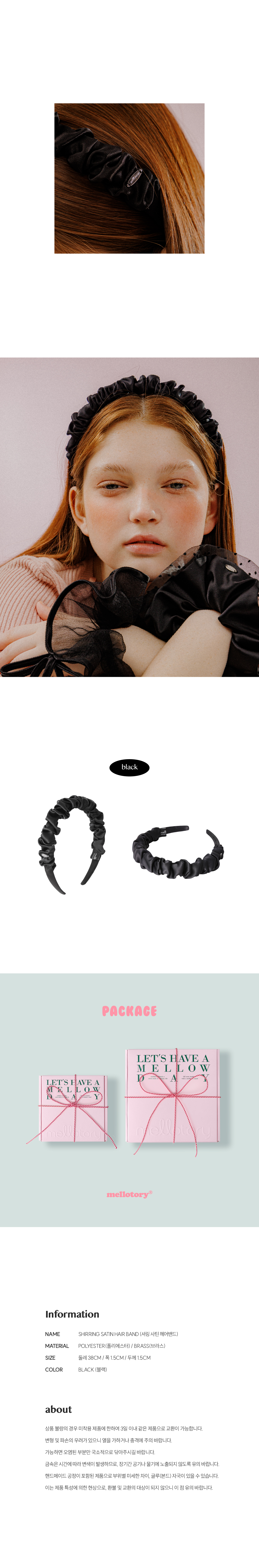 은은한 광택감의 사틴 소재로 핸드메이드 셔링 디테일이 러블리한 무드를 더해주는 헤어밴드. 사이드 라인에 멜로토리의 섬세한 각인 포인트로 고급스러움을 더해주었습니다. 매끄러운 터치감과 편안한 착용감이 특징입니다.