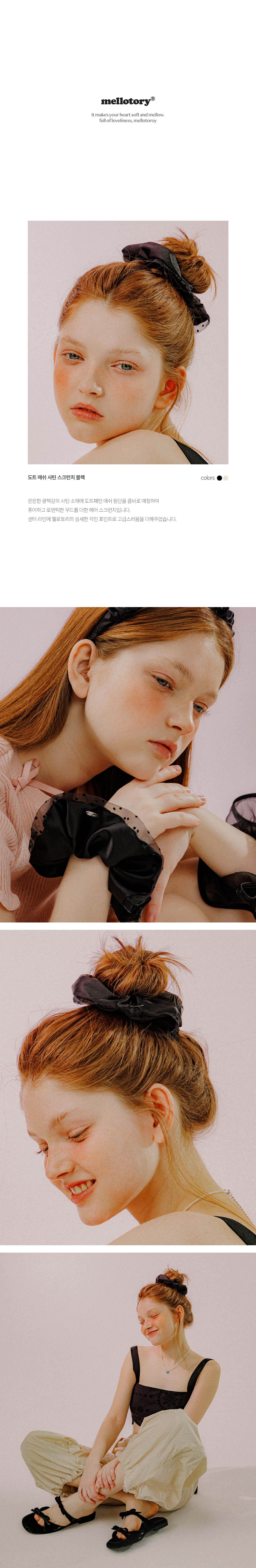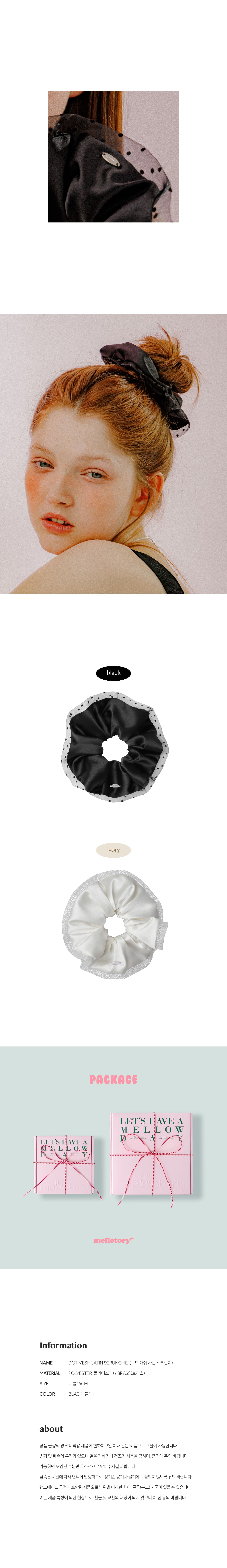 은은한 광택감의 사틴 소재에 도트패턴 매쉬 원단을 콤비로 매칭하여 퓨어하고 로맨틱한 무드를 더한 헤어 스크런치