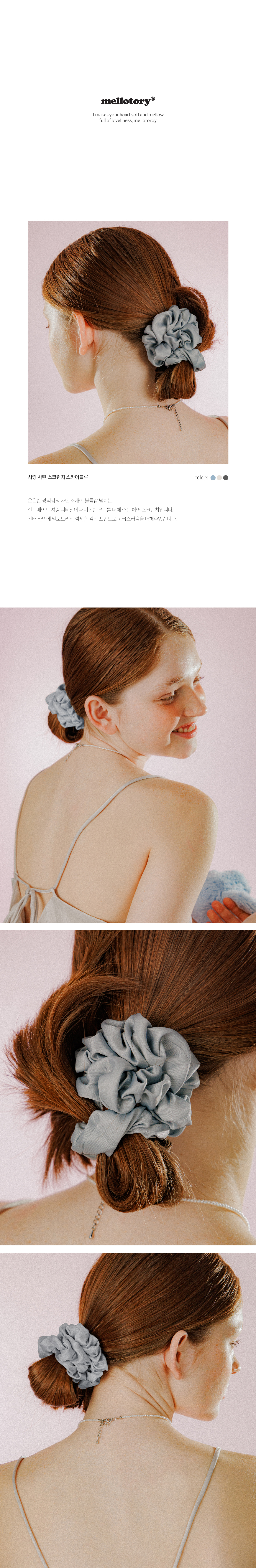 은은한 광택감의 사틴 소재에 볼륨감 넘치는 핸드메이드 셔링 디테일이 패미닌한 무드를 더해주는 헤어 스크런치입니다.