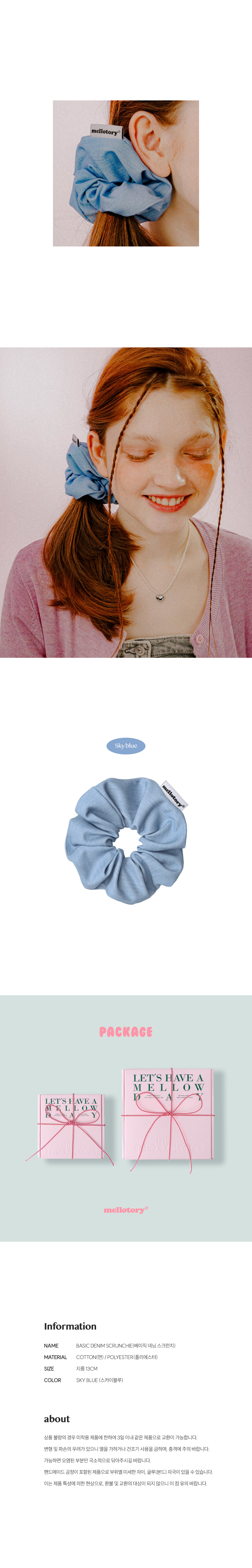 시원한 블루톤의 캐주얼한 데님 소재로 심플하고 베이직한 활용도 좋은 헤어 스크런치.