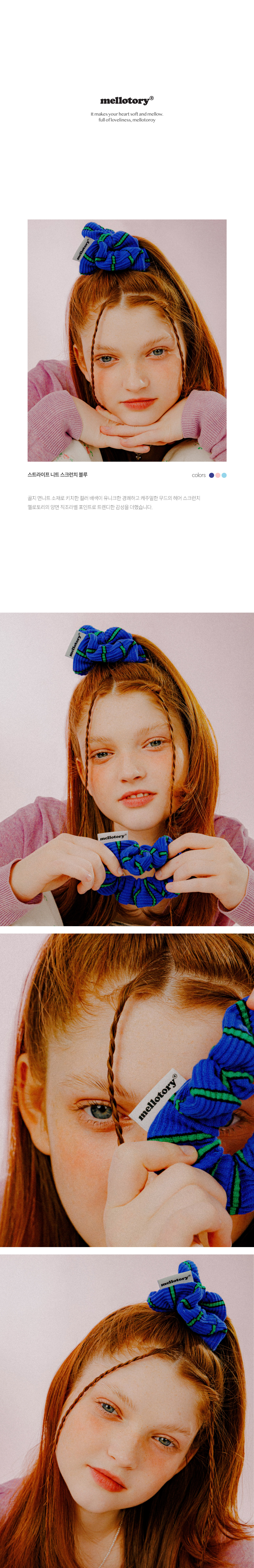 골지 면니트 소재로 키치한 컬러 배색이 유니크한 캐주얼 무드의 헤어 스크런치.
