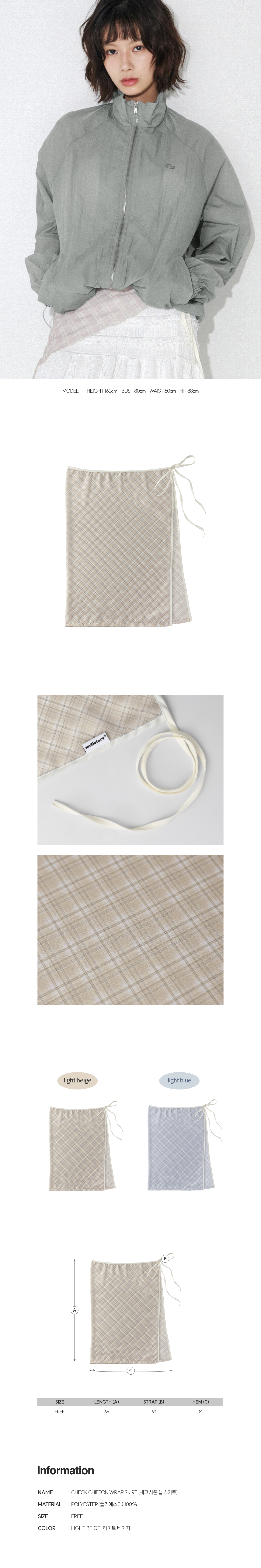 트렌디한 체크 패턴과 하늘하늘한 시폰 소재가 어우러진 가볍고 시원한 랩 스커트로, 무릎선 아래 기장으로 다양한 레이어링에 용이한 아이템입니다.