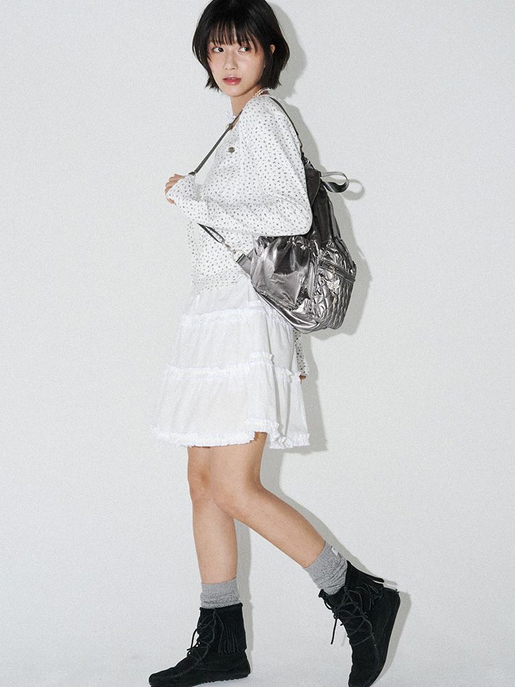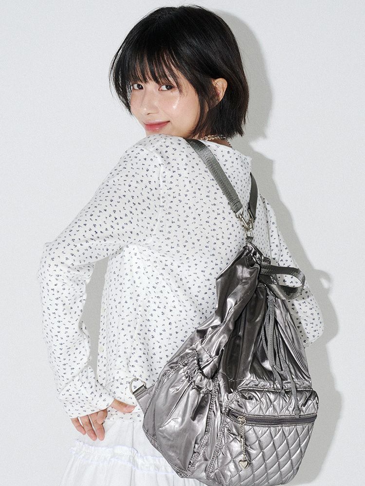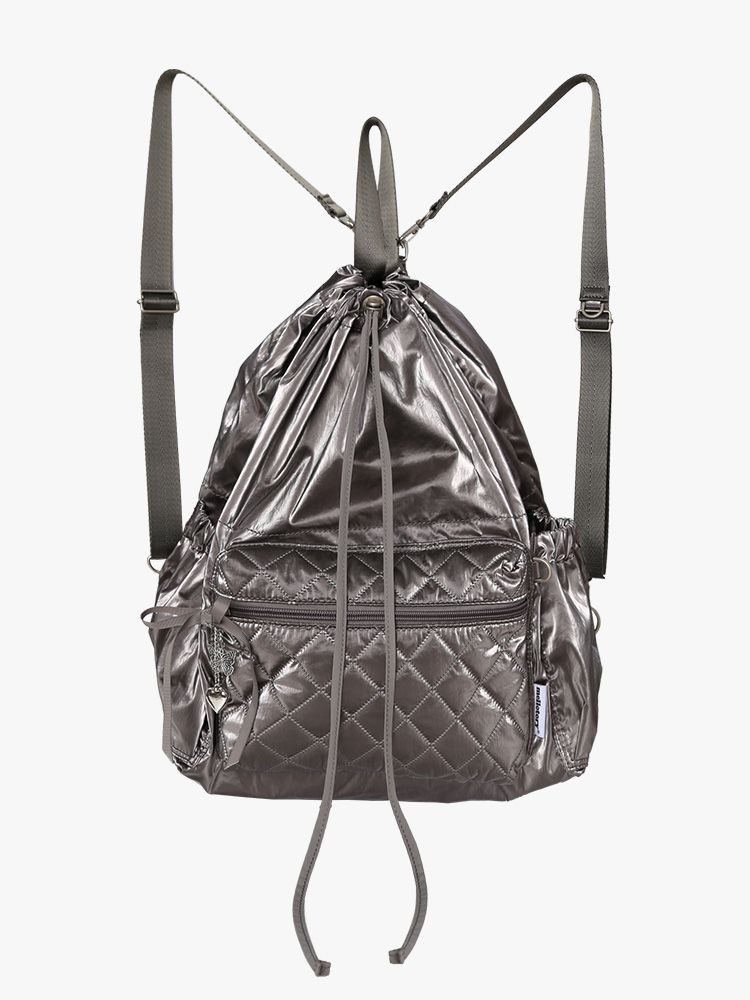 글로시한 광택의 메탈릭한 패브릭을 사용한 스트링 백팩입니다.