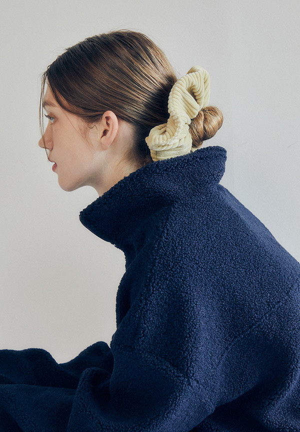 포근한 파스텔 컬러의 코듀로이 소재와 볼드한 실루엣이 어우러져 풍성한 볼륨감에 클래식 무드를 겸비한 스크런치.